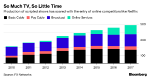 La cantidad de programas de televisión con guiones hechos en los Estados Unidos alcanzó un nuevo récord en 2017, lo que refleja los esfuerzos crecientes de Netflix, Amazon y YouTube para robar a los televidentes y anunciantes de las redes tradicionales.