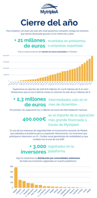 La plataforma de crowdlending para empresas MytripleA ha cerrado el ejercicio 2017 con un volumen de préstamos acumulado de 21M€ para 400 proyectos empresariales desde el inicio de su actividad en 2014. En 2017, MytripleA intermedió 12,8M€ casi duplicando los 6.8M€ prestados en 2016. Sólo en los últimos seis meses del pasado ejercicio, la plataforma de crowdlending consiguió financiación en préstamos para empresas españolas por valor de 9.7M€.