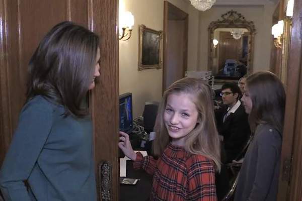 Justo en ese momento, el Rey se encuentra grabando el mensaje de Nochebuena, por lo que en ficcionado plató (como si estuviesen en el aire en mitad de un informativo de la segunda edición de Televisión Española) Letizia corrige a sus hijas: «¡Shh! ¡Hablad bajito». Cuando finaliza el vídeo y la grabación, la Reina invita a sus hijas a pasar a saludar y besar a su padre, un cariñoso Felipe al que se le escapan las sonrisas con la llegada de sus dos pequeñas.