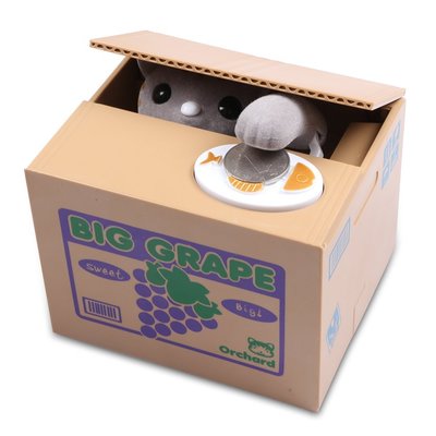 Para guardar las monedas hay que colocarlas en una especie de rejilla. Al hacer presión, la tapa se abrirá y saldrá un gato llevándose la moneda dentro de la caja-hucha. Vamos, que parecerá que te la está robando. Es, sin duda alguna, un regalo bastante divertido, a la par que útil.