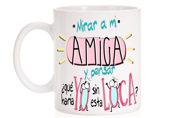 Regalar tazas está muy de moda, pero no todas las tazas son divertidas y originales, ¿No es cierto? El mensaje de esta taza de Amazon es bastante alegre; Mirar a mi amiga y pensar, ¿Qué haría yo sin esta loca?, por lo que seguro que a tu mejor amiga le encanta el detalle.