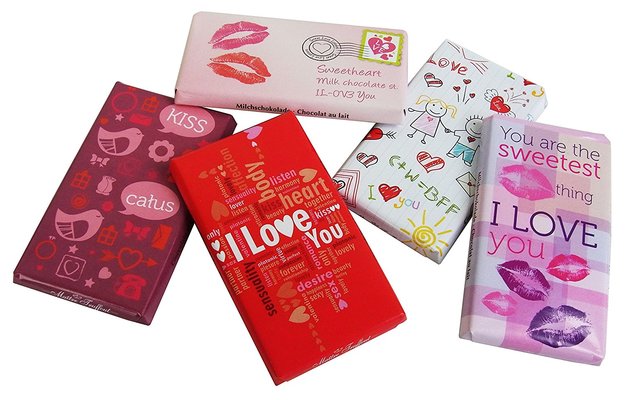 Todas estas tabletas de chocolate tienen motivos amoroso y, lo mejor de todo, es que el pack del que estamos hablando incluye las cinco tabletas de chocolate. Tocará compartir, ¿No es cierto? Aunque claro dependerá mucho de tu pareja. Lo mismo no quiere compartir nada contigo.
