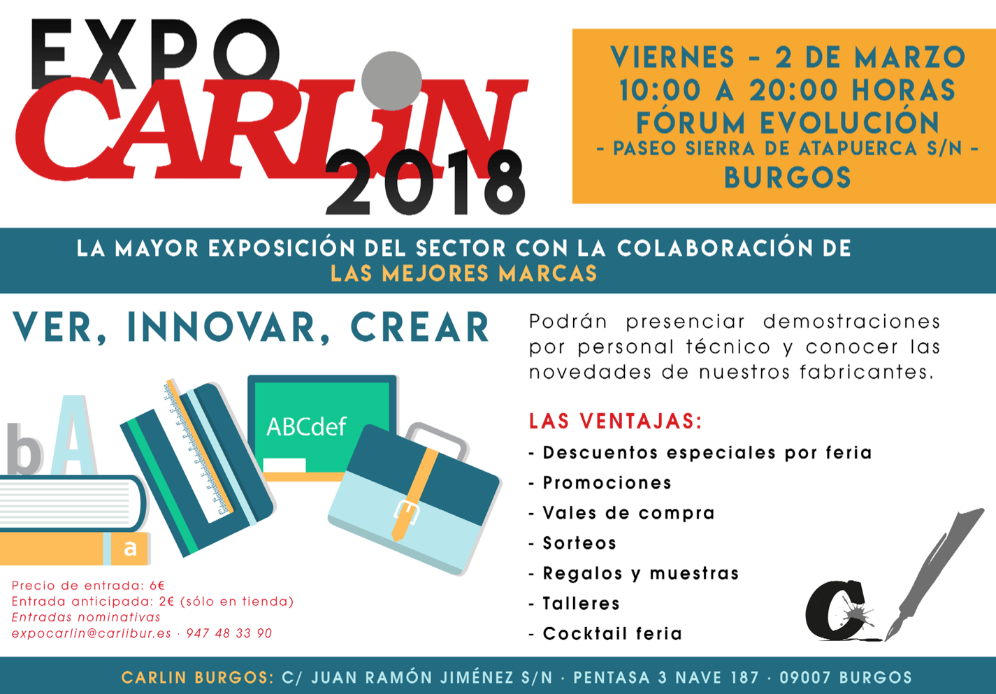 Expo Carlin es una de las exposiciones más importantes de nuestro país, tanto por la cantidad de expositores como por las más de 80 marcas representadas. El propósito es dar a conocer la gama de productos y servicios que Carlin es capaz de ofrecer, dando una solución prácticamente total al sector escolar, empresarial y de administración. Se mostrarán las últimas tendencias de Carlin, sus productos y soluciones tecnológicas y las novedades de sus fabricantes. Esta cita reunirá a profesionales de los distintos centros educativos de Burgos y alrededores, así como a todos los interesados en el mundo escolar y de papelería.