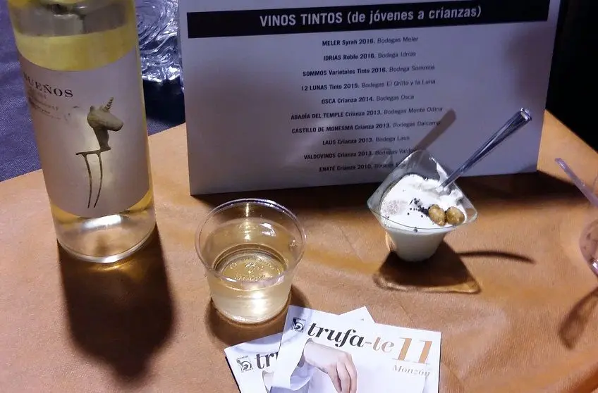 Bodegas Obergo se unía a la iniciativa de la Diputación de Huesca y proponía regar la tuber melanosporum con su vino blanco Sueños by Obergo. Este chardonnay maridaba a la perfección por sus notas florales y balsámicas con las propuestas que se ofrecían. Por ejemplo, Sueños by Obergo potenciaba el sabor de la brandada de bacalao sobre crema de calabazas del Restaurante Acapulco de Monzón. También armonizaba muy bien con el bacalao en tempura de azafrán del Hotel MasMonzón, una de las primeras tapas en agotarse.
