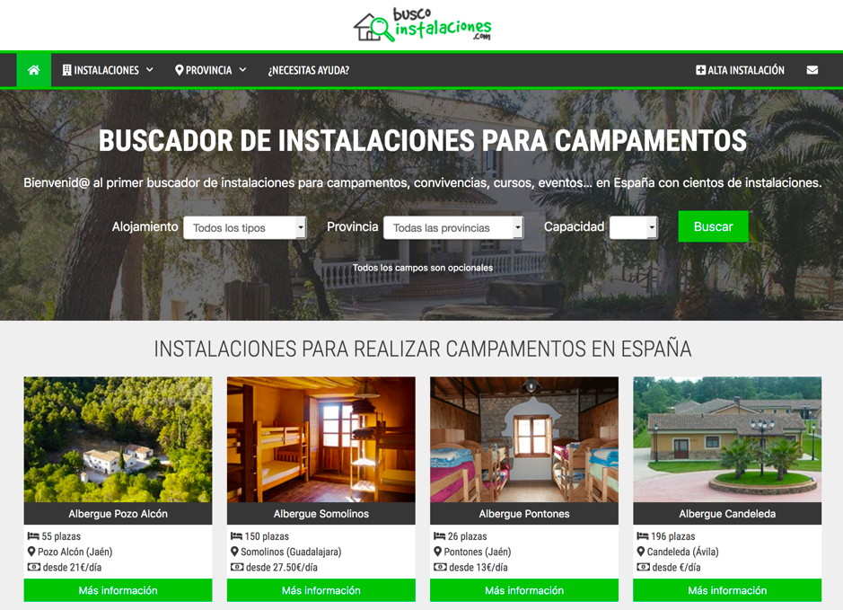 Ya puede accederse a BuscoInstalaciones.com, el primer buscador de instalaciones para campamentos en España. Un proyecto digital que trata dar respuesta a una problemática que se repite a menudo, facilitando la búsqueda de instalaciones para todos los organismos, centro educativos, etc, que realizan acampadas o campamentos a lo largo de todo el año.