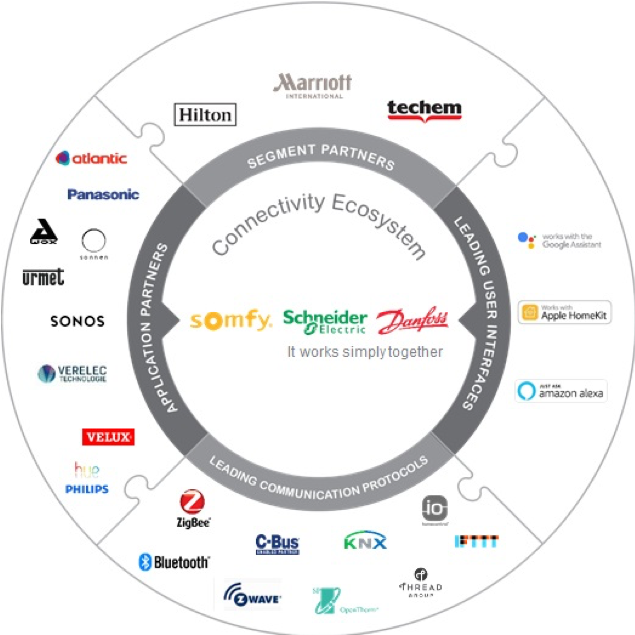 Schneider Electric, Danfoss y Somfy creen que ha llegado el momento de que las principales empresas del sector se unan para acelerar la conectividad y ofrecer soluciones eficientes que funcionen conjuntamente. A través de esta alianza, los tres líderes mundiales aportan su propia experiencia en control de iluminación, calefacción y persianas, con el apoyo de una red profesional de instaladores.