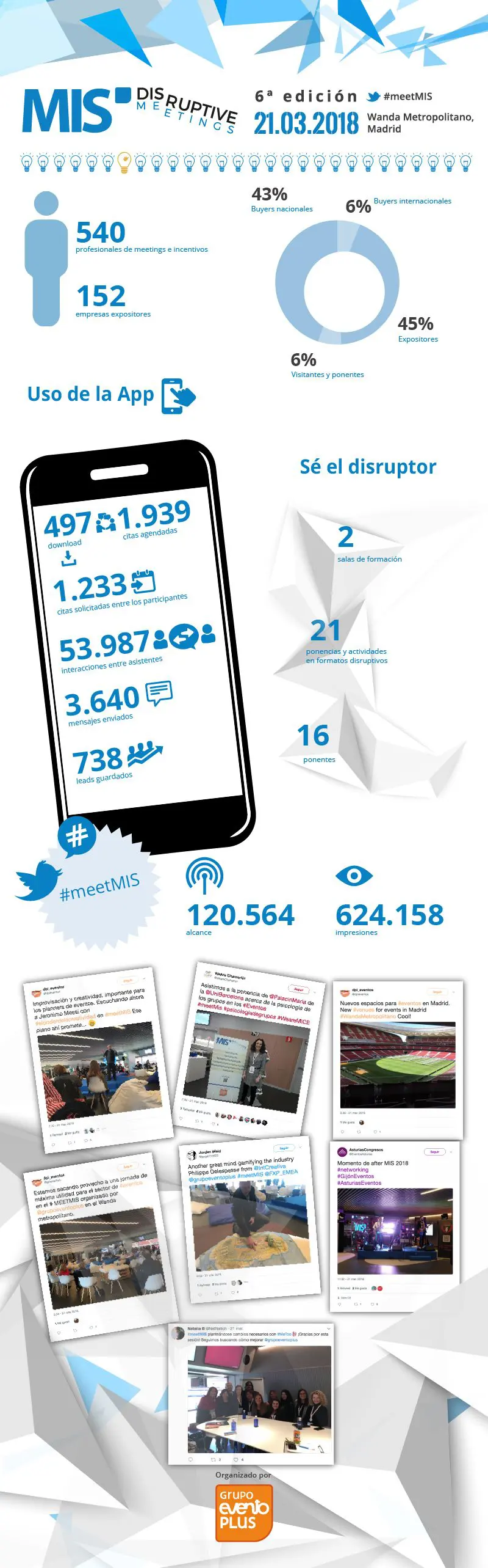 El MIS contó este año con la presencia de profesionales del sector que venían desde Freeman XP, Cisco Live y Jack Morton Worldwide, entre otras empresas internacionales. En línea con la filosofía que Grupo eventoplus ha adoptado desde sus inicios, se apostó por la combinación de distintas áreas de conocimiento desde una perspectiva disruptiva, lo que convirtió al MIS en una central de conocimiento e innovación para el sector, dónde se habló de temas como la psicología de grupos, incubadoras creativas, soluciones de aprendizaje alternativas o el nuevo reglamento de protección de datos, entre otros muchos. La audiencia pudo formar parte de un debate crucial para el sector en el que también se lanzaban temas que conciernen al mundo laboral en un ámbito global, como el primer diálogo entre profesionales del sector sobre #MeToo.