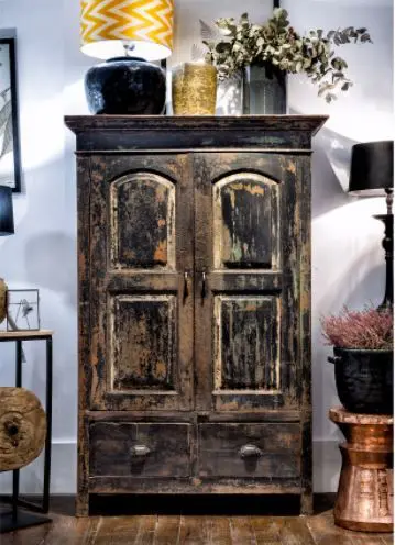Las piezas de piel o con acabados desgastados son perfectas para coronar las estancias. Una butaca de piel en un tono oscuro y fuerte puede ser el complemento perfecto para un salón. Otra opción es añadir una pieza grande y lustrosa, como un armario antiguo francés con diferentes capas de policromía decapadas, como el que propone Sandra Marcos de su colección.