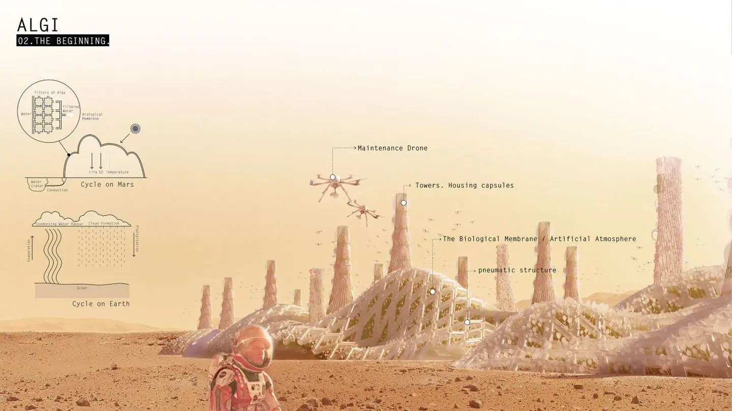 El proyecto presentado por el Innovation Lab de IED Madrid se llama Algi: este es el nombre con el que bautizan la primera ciudad en Marte, una sociedad colaborativa protegida por una membrana biológica que contiene algas y agua. Algi busca ser una ciudad sin desperdicios implementando una alta participación ciudadana, una comunidad responsable que coexiste con el entorno, sin desconectar de la Tierra, pues parte de sus objetivos son ayudar a reciclar materiales terrestres que servirán en la nueva colonia: El plástico de la Tierra es llevado a Marte para ser reciclado y usado como filamento para impresión 3D de estructuras.