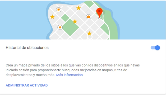 El historial de ubicaciones te permitirá crear un mapa mediante los dispositivos con los que viajes para, según nos dice Google, ‘proporcionarte búsquedas mejoradas en mapas, rutas de desplazamiento y mucho más’. Esta información también podrás borrarla desde el apartado de ‘Actividad en Web y en Aplicaciones’.