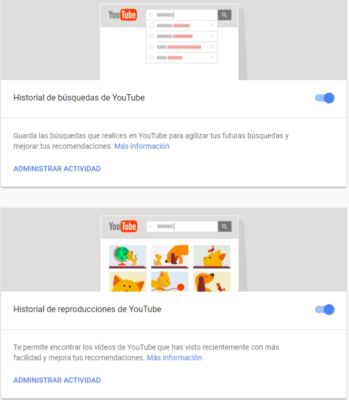 Las búsquedas de YouTube también se almacenan y sirven para mostrarte los anuncios que se suelen ver. Además, no solo se guarda el historial de búsquedas, también el historial de reproducción. ¿Que quieres borrarlos y empezar de cero? No hay problema. Tan solo tendrás que pulsar en ‘administrar actividad’ y seguir los mismos pasos que en ‘Actividad en Web y en Aplicaciones’. Después de esto, toda la información se habrá eliminado.