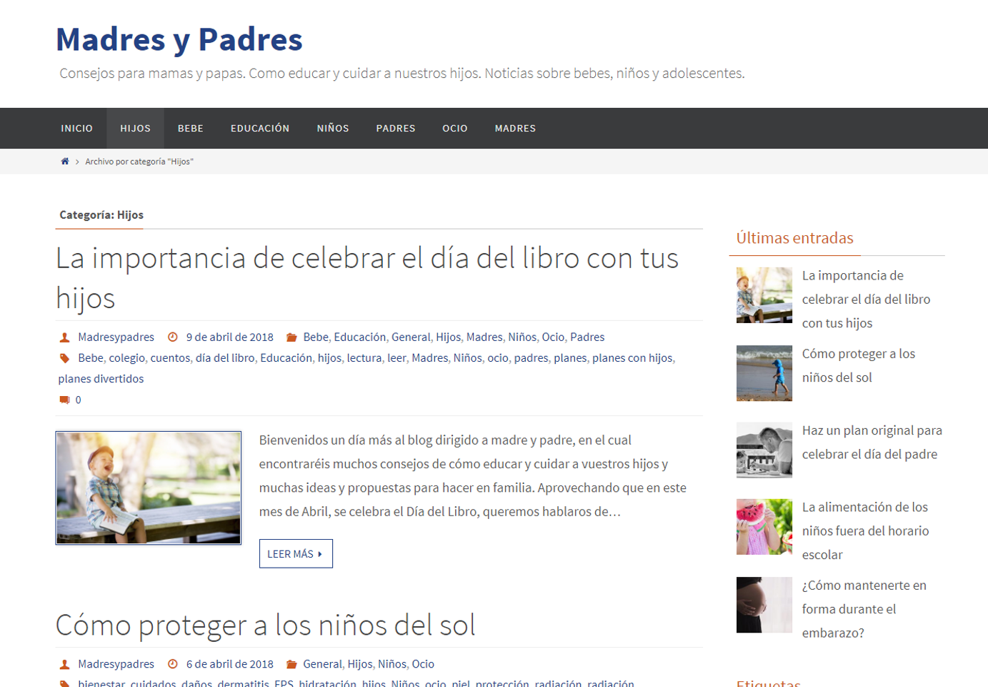 Este blog se llama madresypadres.net y está dividido en ocho categorías: inicio, hijos, bebé, educación, niños, padres, madres y ocio. En el inicio se encuentran los últimos artículos publicados con tal de que lo primero que vea el usuario al entrar sean las noticias más actuales y del momento. Además, a partir de aquí se puede acceder a cualquier otra categoría con tal de filtrar por el tema de interés del usuario.