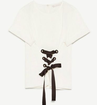 Pero esta idea no llegó a buen puerto, especialmente porque, en este caso, los lazos que se suelen poner en la parte trasera del corset estaban por delante. No fue una camiseta visualmente bonita ni tampoco cómoda ya que parecía que llevabas un nudo en la parte de la barriga. Fue otra de las prendas imposibles de Zara que no llegó a triunfar en tienda.