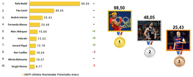 En base al índice que muestra cuales son los deportistas con mejor imagen asociados a determinados deportes, además de mostrar sobre una base 100 cuán fuerte es la asociación; Rafa Nadal y Pau Gasol ganan por goleada a los futbolistas. Al menos a nivel nacional.