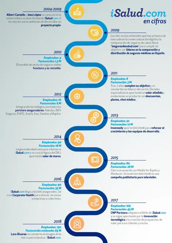 El comparador nace en 2009 de la mano de Albert Castells y José López bajo el nombre de isegurosdesalud.com. La idea es crear un modelo integral en el que exista una gestión propia de clientes donde el objetivo es convertirse en líderes en la comparación y la distribución de seguros médicos en España.