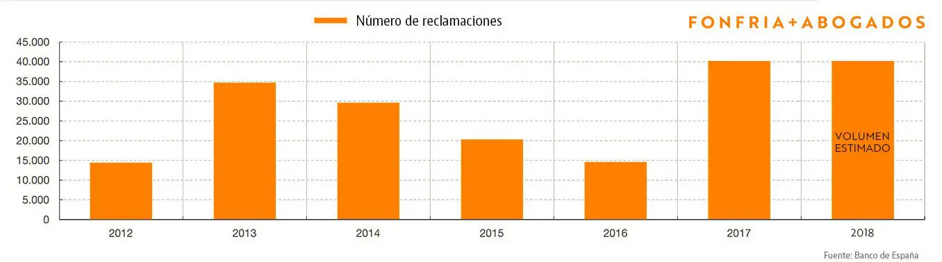 Los consumidores cerraron 2017 con un récord de reclamaciones contra las entidades financieras: 40.172 en total, de acuerdo a los datos facilitados por el Banco de España. Según Fonfria + Abogados en 2018, a pesar de que las cifras son todavía provisionales, el número de reclamaciones mantiene un ritmo muy parecido al del año anterior, con más de 10.000 reclamaciones durante este primer trimestre. Si se cumplen las estimaciones, el año cerrará con un volumen similar al de 2017 e incluso superior.