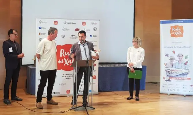 El acto protocolario ha continuado con la intervención del Sr. Jaume Martí, Presidente del Gremio de Hostelería de Vilanova i la Geltrú, ha hecho entrega de un gran mortero de mármol a Oriol Castro como agradecimiento por la labor de embajador de este año. Éste, con el regalo en brazos, explicó que se ha sentido orgulloso de representar la Ruta del Xató y su territorio. Castro, ha explicado a todos los asistentes al acto que en su taller creativo de cocina han experimentado y elaborado todas las recetas de xató, hasta crear una receta propia y modernizada, un cornete con salsa de xató. Oriol Castro también ha querido resaltar su experiencia en cada uno de los municipios, y se ha maravillado de la efervescencia cultural y gastronómica que tiene el xató en las personas del territorio, sin duda, un patrimonio turístico genuino para exportar.