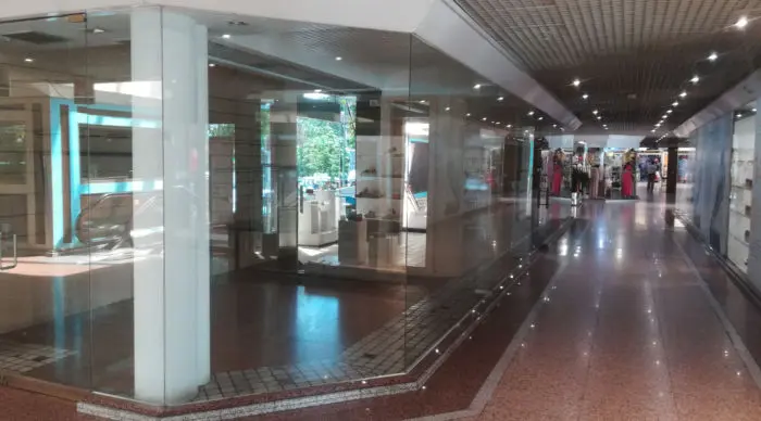 En esta planta inferior hay al menos otros dos locales cerrados. Uno de ellos tiene aspecto de haber albergado una casa de apuestas deportivas. El otro es un restaurante con un salón enorme que está justo en frente del DIA. En mitad de la superficie resiste un pequeño recinto para arreglos de ropa. Una perfumería y una tienda souvernirs escoltan a este pequeño local.