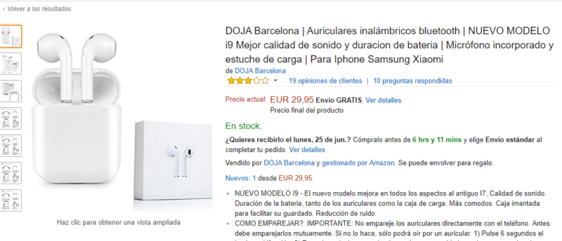 Otras, como Carrefour, solo se centran en la distribución del artículo. Si se visita la web del supermercado podremos observar el anuncio de unos “Auriculares inalámbricos estilo AirPods” que cuestan, tan solo, 19.90 euros. El modelo ofertado es el i7s, uno de los más vendidos en las webs. Pero, si quieres hacerte con estos cascos, únicamente podrás hacerlo desde internet, ya que Carrefour lo ofrece como un exclusivo de la web. Por lo tanto, al precio anterior hay que sumarle 5 euros de gastos de envíos, una estrategia que les permite sumar euros a su beneficio final.