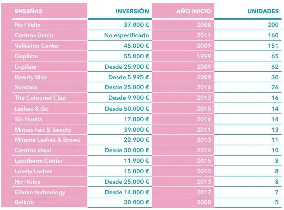 Tras la irrupción de grandes de la industria como No + Vello en España allá por el año 2007, el sector de las franquicias de estética y belleza empezó a crecer en nuestro país de forma que proliferaban locales en cada rincón de la geografía nacional. Hoy en día este sector se convierte en un diverso conglomerado de todo tipo de servicios destinados al cuidado del cuerpo: depilación, peluquería, tintes y extensiones, manicura y pedicura, rejuvenecimiento, etc.
