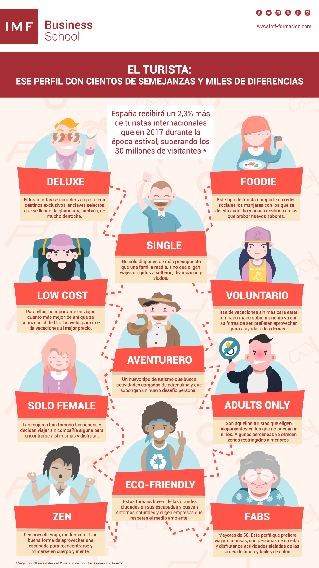Sin embargo, el desarrollo de la oferta turística unido al aumento de una demanda cada vez más variopinta ha dado lugar a nuevos perfiles, que poco o nada tienen que ver con la imagen de turistas con hijos cargados de maletas en destinos con una gran oferta de actividades en las que mantener entretenida a toda la familia. IMF Business School ha analizado cómo son los perfiles de los nuevos turistas: