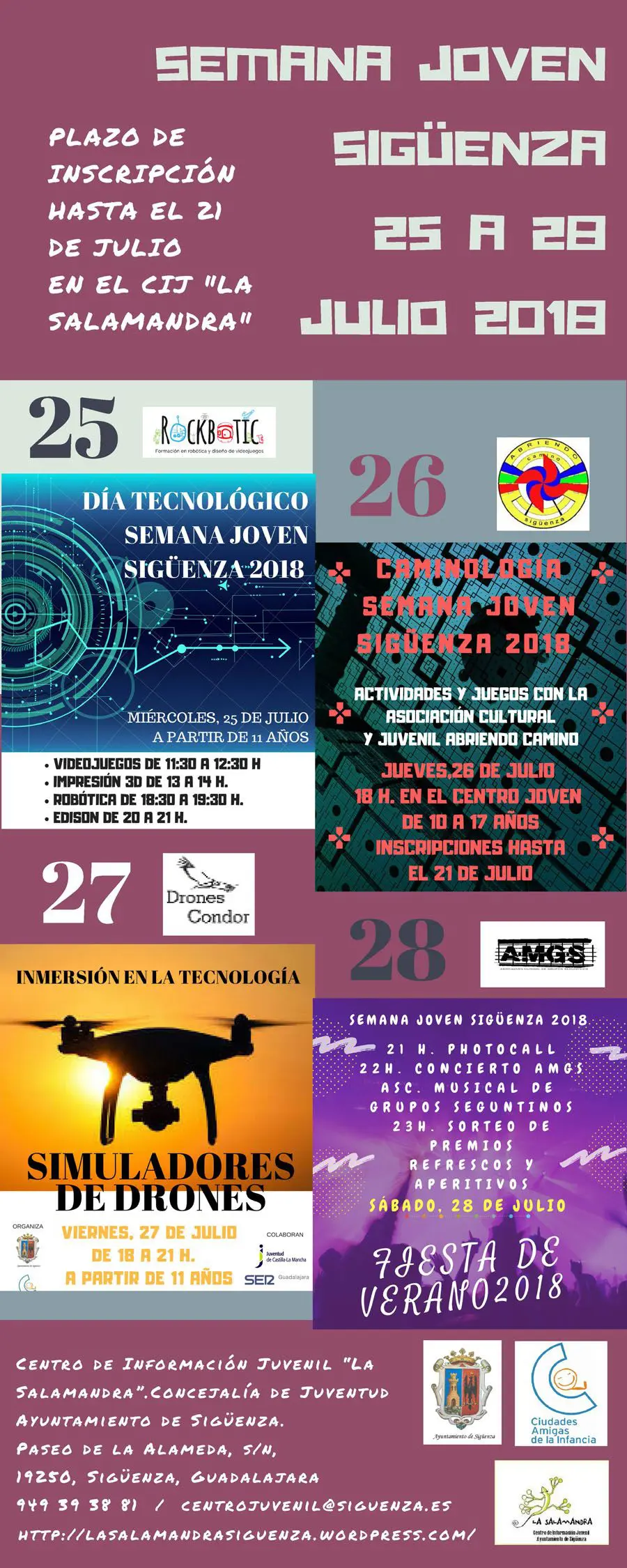 Ya está aquí la Semana Joven de Sigüenza 2018 que organiza en el mes de julio el Centro de Información Juvenil La Salamandra. Este año gira en torno a la tecnología. El sábado de esta semana, 21 de julio, finaliza el plazo de inscripciones en algunos de los talleres, que tienen plazas limitadas.