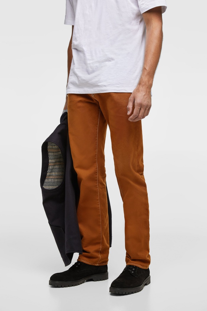 Parece ser que el color teja será uno de los colores de la próxima temporada. Este pantalón con corte recto y detalle de pespuntes a contraste lo demuestra. Además, tiene dos bolsillos laterales y dos en la parte posterior del pantalón. Trabillas para el cinturón y cierre frontal de botón que se oculta con una tapeta.
