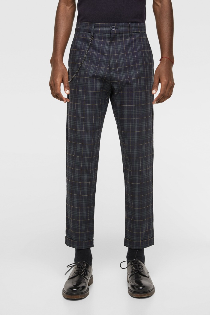 El pantalón de cuadros volverá a ser una tendencia muy fuerte en la próxima temporada, especialmente el pantalón chino de corte carrot. En el modelo de Zara, encontramos este modelo con dos bolsillos laterales y dos de doble vivo abotonados en la parte posterior. Cintura con trabillas con cadena colgante y cierre frontal con cremallera oculta por tapeta y botón al aire.