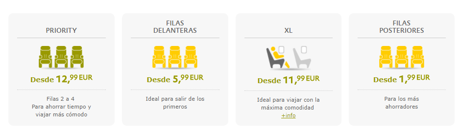 Después, ofrece los de las filas delanteras para salir antes del avión por 5,99 euros. En tercer lugar, están los ‘XL’. Por 11,99 euros el usuario podrá viajar en los asientos más cómodos de todo el pasaje. Y para los ahorradores, por 1,99 euros puedes elegir asientos en las filas posteriores.