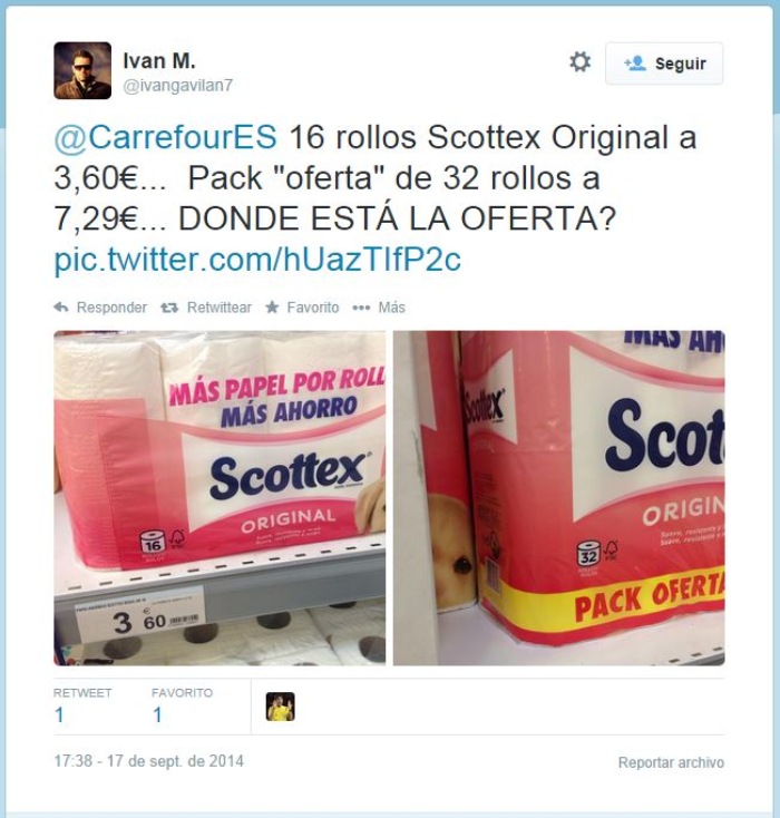 El usuario de Twitter Ivan M. colgó esta fotografía quejándose del pack de oferta que ofrecía Carrefour en el papel higiénico de Scottex. Pero, ¿De qué se quejaba Ivan? Pues de que mientras 16 rollos de papel higiénico costaban 3,60 euros, 32 paquetes costaban 7,29 euros. Al final, si escogías el pack ahorro, pagabas 9 céntimos más por lo mismo. Que sí, que no es una cantidad de dinero desmesurada pero, lo dicho, ¿Dónde está el ahorro?
