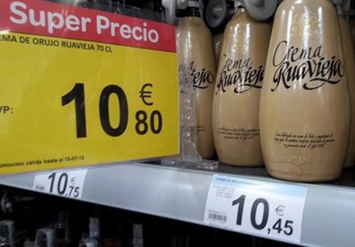 Hace algún que otro verano que Carrefour decidió poner en oferta la Crema de Orujo Ruavieja. El precio que pusieron era de 10,80 euros, que hubiese estado bien si justo debajo del producto no pusiera su precio original, que era de 10,45 euros.