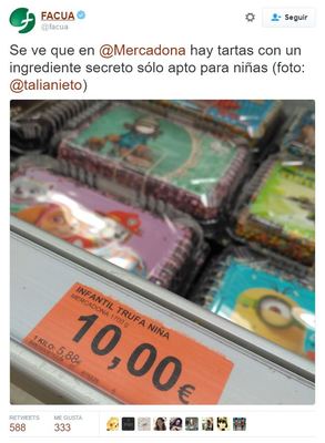 La denuncia de este suceso llegó a través de Twitter cuando una usuaria de la red social, y consumidora de Mercadona, subió una imagen de dicha tarta con su cartel correspondiente. Rápidamente llegó a la FACUA, que decidieron distribuir dicha imagen para que todo el mundo fuese testigo del sexismo en la sección de tartas de Mercadona.
