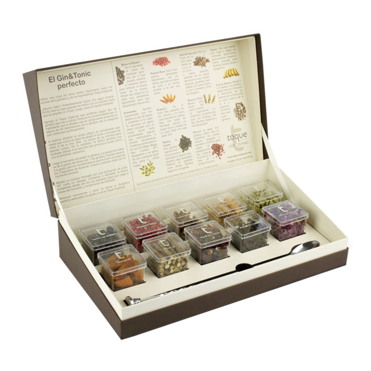 En este pack encontramos los siguientes productos: Regaliz, cassia, bayas de enebro, cardamomo, pimienta rosa, pimienta cubeba, kumquat, flor de hibisco, anís estrellado, pétalos de rosa. Además también incluyen un recetario y una cucharilla profesional de coctelería. Y todo por 31,65 euros.