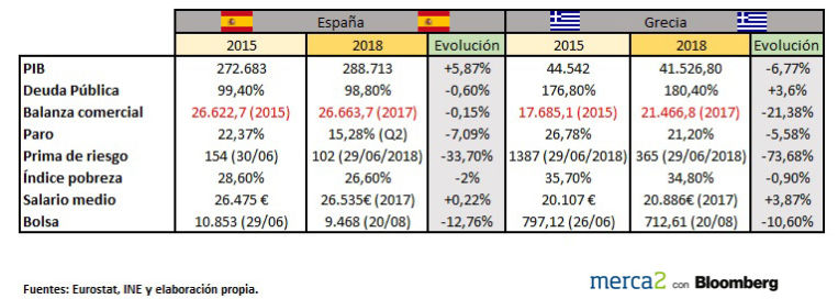 En estos tres años, España ha sido un ejemplo de país para los políticos y analistas desde el punto de vista económico. Su Producto Interior Bruto (PIB) ha crecido un 5,7 % y el paro ha caído más de un 7 %, lo que ha permitido que la temida prima de riesgo cayera más de 50 puntos básicos (casi un tercio). En el caso de Grecia, el PIB ha seguido bajando (-6,77 %), pero también lo ha hecho el paro (-5,58 %). Ambas balanzas comerciales son negativas, hay más importaciones que exportaciones, pero la española se mantiene estable mientras la griega ha ahondado sus números negativos.