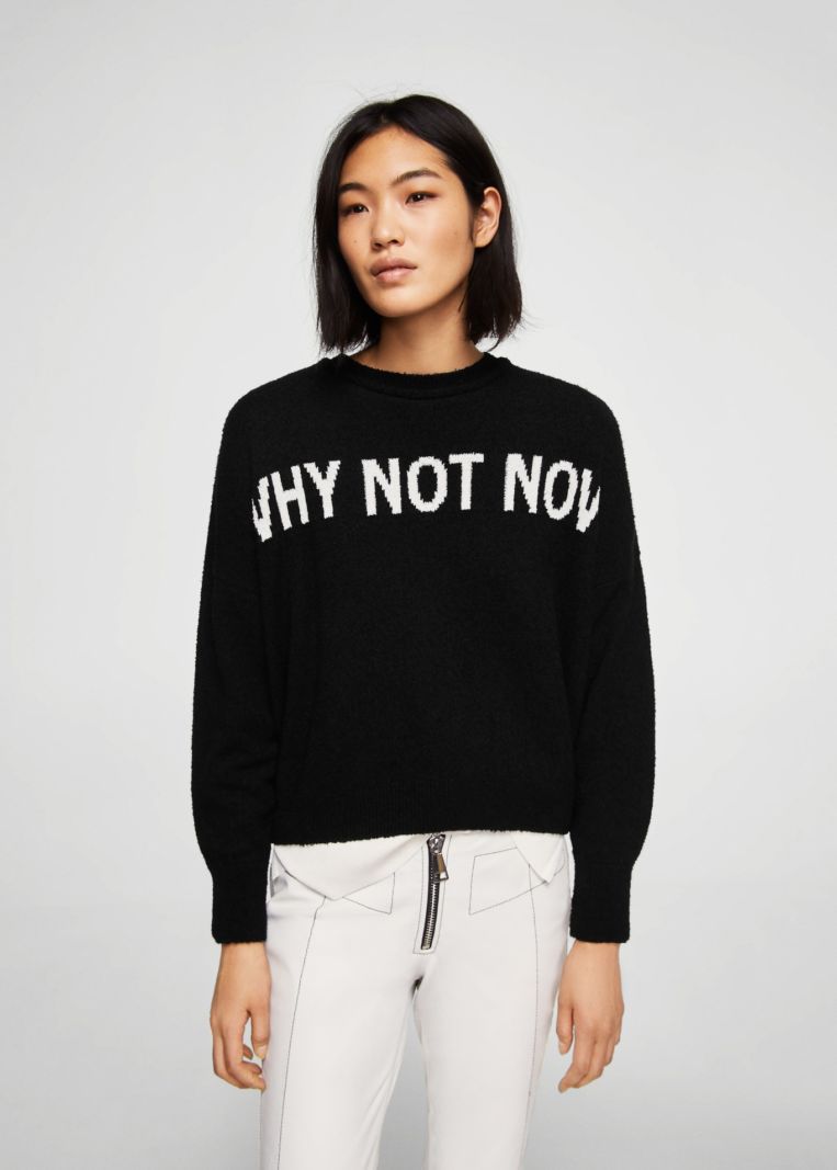 Las sudaderas, camisetas y jerséis con mensaje han triunfado durante la pasada temporada. Es por eso mismo por lo que Mango ha rescatado este jersey con mensaje para que te vayas preparando para el otoño de color negro. La idea nos encanta y es que, al fin y al cabo, es un básico con un toque especial y diferente.