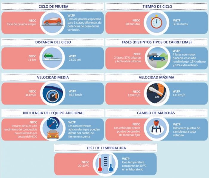 La infografía de la Asociación Europea de Fabricantes de Automóviles (ACEA) muestra las principales diferencias y novedades entre el NEDC y el WLPT.