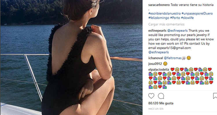 Sara es muy querida y casi todas sus fotos se hacen virales. Actualmente trabaja en una campaña de moda de verano para Calzedonia. Y como no, se hace fotos con los bikinis de la marca. La foto de arriba tiene unos impresionantes 80.000 me gusta y es de hace un sólo día. Recordar que Sara es la mujer de un famoso español, también muy querido, el mítico portero Iker Casillas.