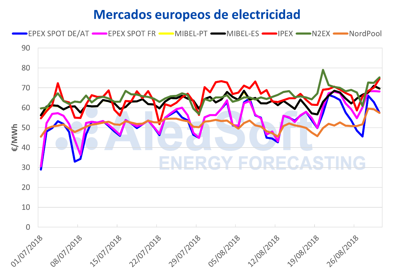 La situación de las centrales nucleares en Francia tampoco ayuda, con una gran parte de su parque parado, está encareciendo el precio de su mercado eléctrico, y está arrastrando el resto de mercados europeos conectados. Según AleaSoft, esta situación, junto con la situación de los combustibles y el CO2 antes expuesta, ha favorecido que, en estas últimas dos semanas, desde el 20 de agosto, los precios de los principales mercados eléctricos de Europa Occidental hayan incrementado y se hayan situado alrededor de los 70 €/MWh, el precio de los mercados tradicionalmente más caros. La excepción estaba siendo el mercado nórdico NordPool que, aunque registraba precios mucho más caros que el verano anterior, se había mantenido alrededor de los 50 €/MWh, hasta el martes 28 de agosto cuando saltó hasta rozar los 60 €/MWh.