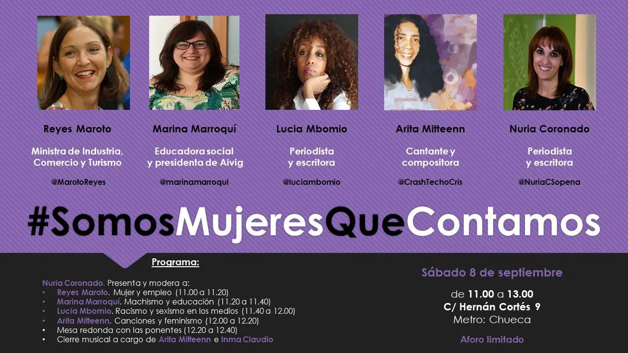 El próximo 8 de septiembre «el patriarcado se va a caer» con la celebración #SomosMujeresQueContamos, el acto que cuenta con la participación de cinco reconocidas feministas que aportarán su experiencia como activistas en la lucha por la igualdad. Se trata de Reyes Maroto, ministra de Industria, Comercio y Turismo; Marina Marroquí, educadora social y presidenta de la Asociación contra la Violencia de Género AIVIG; Arita Mitteenn, cantante y compositora y las periodistas y escritoras Lucia Mbomio y Nuria Coronado. “Se hablará de techos de cristal, oportunidades laborales, corresponsabilidad, educación, racismo, sexismo, violencia de género, cosificación, misoginia, homosexualidad, medios de comunicación o música machista entre otros temas”, explica la organizadora y presentadora del encuentro Nuria Coronado. “Queremos hacer una mirada desde distintos puntos de vista a todo un sistema que no quiere que hombres y mujeres seamos iguales pero que sin lugar a dudas va a desaparecer por justicia y gracias a una lucha política imparable y universal como es la del feminismo”, añade.
