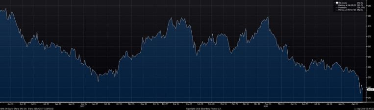 Todo ello genera incertidumbre entre los inversores. No ayuda el diagnóstico del Banco Santander, que ha rebajado el precio objetivo para diciembre de 2019 un 14% desde 164 hasta 142 euros; ni tampoco las caídas generalizadas en el Ibex-35.