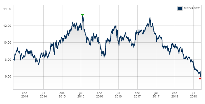 Mediaset, por otra parte, tiene un balance muy saneado con caja neta positiva. Ello facilita el mantenimiento de una rentabilidad por dividendo muy elevada (superior al 8% estimado para 2018). “La pérdida del soporte de los 7,95 euros aumenta las probabilidades de mayores caídas. Un objetivo podría estar en el entorno de los cuatro euros a medio-largo plazo si no mejora los resultados y las perspectivas futuras”, indica el analista de IG.
