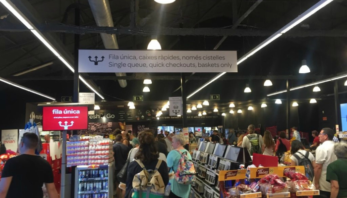 En los rótulos podemos ver perfectamente las letras en catalán e incluso en inglés, pero ni rastro del español, ni siquiera a la hora de esperar las colas en donde podemos ver un letrero que dice ‘Fila única, caixes ràpides, només cistelles‘, que quiere decir ‘fila única, cajas rápidas, solo cestas’. Vamos, que parece que en el Carrefour catalán se han olvidado en alguna parte los letreros en español.