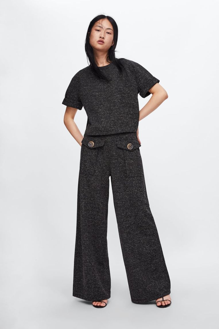 Algo que nos encanta de Zara son sus total looks. En este caso, entre tanto estampado y tanto color metalizado, hemos decidido enseñar este conjunto compuesto por una camiseta de cuello redondo y mangas cortas y por un pantalón amplio con bolsillos y botones con un color gris antracita.