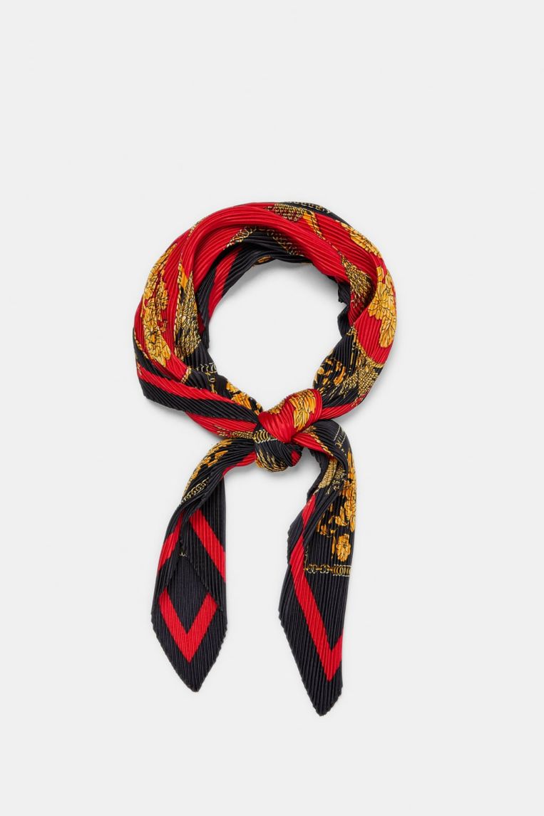 Durante el verano ya hemos visto como empezaba a asomar la tendencia de los pañuelos, pero es ahora en otoño cuando los veremos con más fuerza, especialmente los pañuelos plisados con estampaciones, en este caso de cadenas.