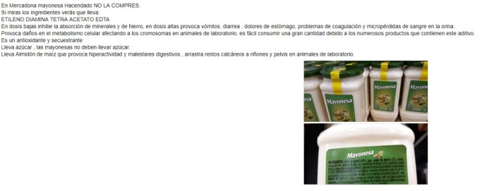En la página en la que se ha extendido el bulo se dice que uno de los componentes, el ácido etilendiaminotetraacético(EDTA), «inhibe la absorción de minerales y de hierro». Además, al llevar azúcar y almidón de maíz, esta mayonesa puede provocar vómitos, diarreas, dolores de estómago, problemas de coagulación y micropérdidas de sangre en la orina. Esto se ha extendido por toda la red y los consumidores habituales de esta mayonesa han puesto cientos de comentarios alertados.