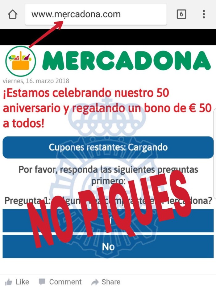 Otro de los timos en los que la policía tuvo que intervenir fue este que decía que Mercadona regalaba 50 euros a todos por contestar a unas preguntas. Querían celebrar su 50 aniversario a lo grande y por eso iban a regalar tanto dinero. Pero si tenemos en cuenta que la empresa se fundó en el año 1977, y que estamos en el 2018, aún no ha llegado dicho aniversario. ¿Cómo van a regalar entonces ese dinero? Claro está que no todo el mundo sabe la fecha de fundación de la empresa, por lo que picar puede parecer muy fácil.