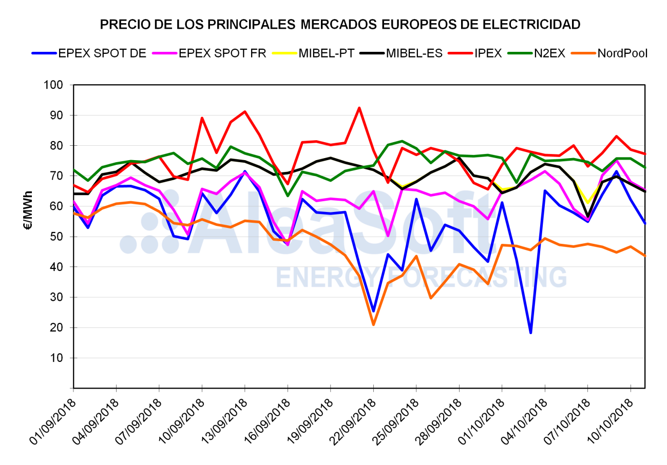 En el resto de mercados europeos, el precio promedio de los últimos siete días, desde el 5 de octubre, ha aumentado, a excepción del mercado N2EX de UK. El mayor aumento, de 13,98 €/MWh, se produjo en el mercado de Alemania EPEX SPOT, que según ha analizado AleaSoft se debe a una mayor demanda eléctrica y a una menor producción eólica.