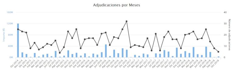 No se puede decir que el Gobierno haya olvidado a Indra. Desde octubre de 2014, la tecnológica ha conseguido 757 adjudicaciones públicas por valor de 172,2 millones de euros. No obstante, la situación ha cambiado desde julio. Como se puede observar en el gráfico, durante los últimos meses los contratos se han visto reducidos ostensiblemente.