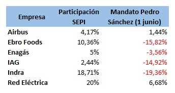 Cuatro de las seis empresas con presencia en su accionariado de la Sociedad Estatal de Participaciones Industriales (SEPI) que cotizan en Bolsa presentan caídas desde que Pedro Sánchez prometió el cargo de presidente del Gobierno de España el pasado 2 de junio.