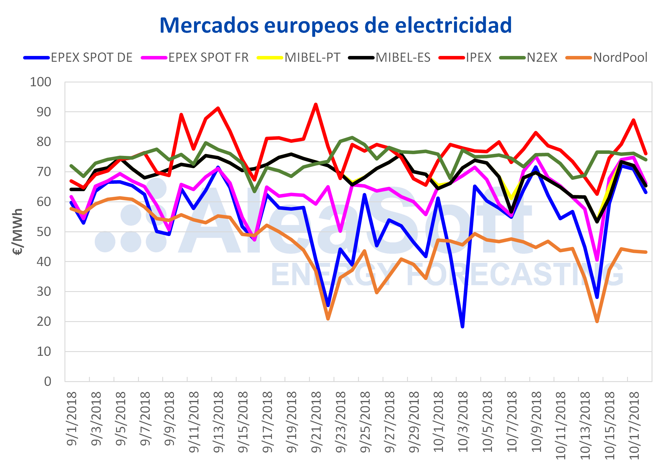 Desde comienzos de octubre los precios de los mercados MIBEL España y Portugal y EPEX SPOT Francia han comenzado a converger entre los 64 €/MWh y los 65 €/MWh. El mercado NordPool de los países nórdicos sigue siendo el más barato entre los principales mercados europeos y en los últimos siete días, desde el 12 de octubre ha descendido 8,03 €/MWh respecto a los siete días anteriores. En general, el precio de los principales mercados europeos ha disminuido respecto a los siete días anteriores, y el mercado italiano IPEX y el británico N2EX se mantienen como los más altos.